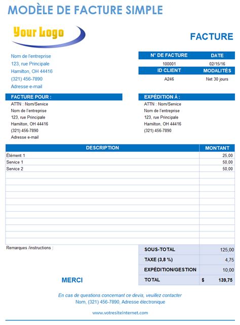 Modèles de facture professionnels pour rationaliser la facturation de votre entreprise. Modèle personnalisable de facture à télécharger pour toute entreprise souhaitant facturer une prestation à un client. Vous pouvez également ajouter des lignes et des .